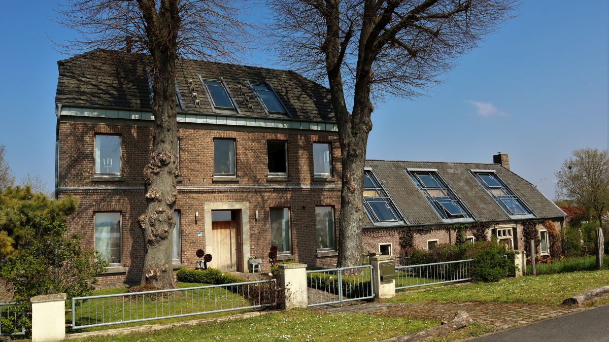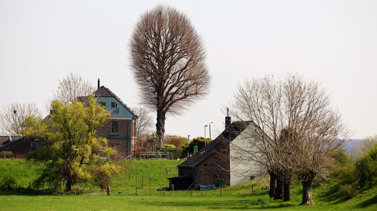 Wir überqueren die Bislicher Straße und biegen nach wenigen Metern nach links in die Obstplantage Clostermann ab. Am Kiesförderband geht es rechts und nach ca. 100 m wieder links bis zu den Wirtschaftsgebäuden und dem Herrenhaus. Kurz vorher befindet sich ein kleines Haus mit einem leeren Storchennest.