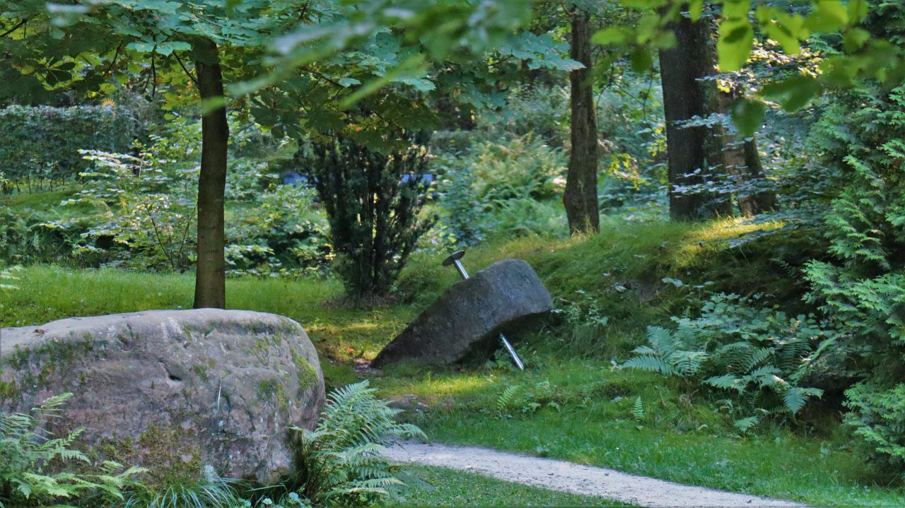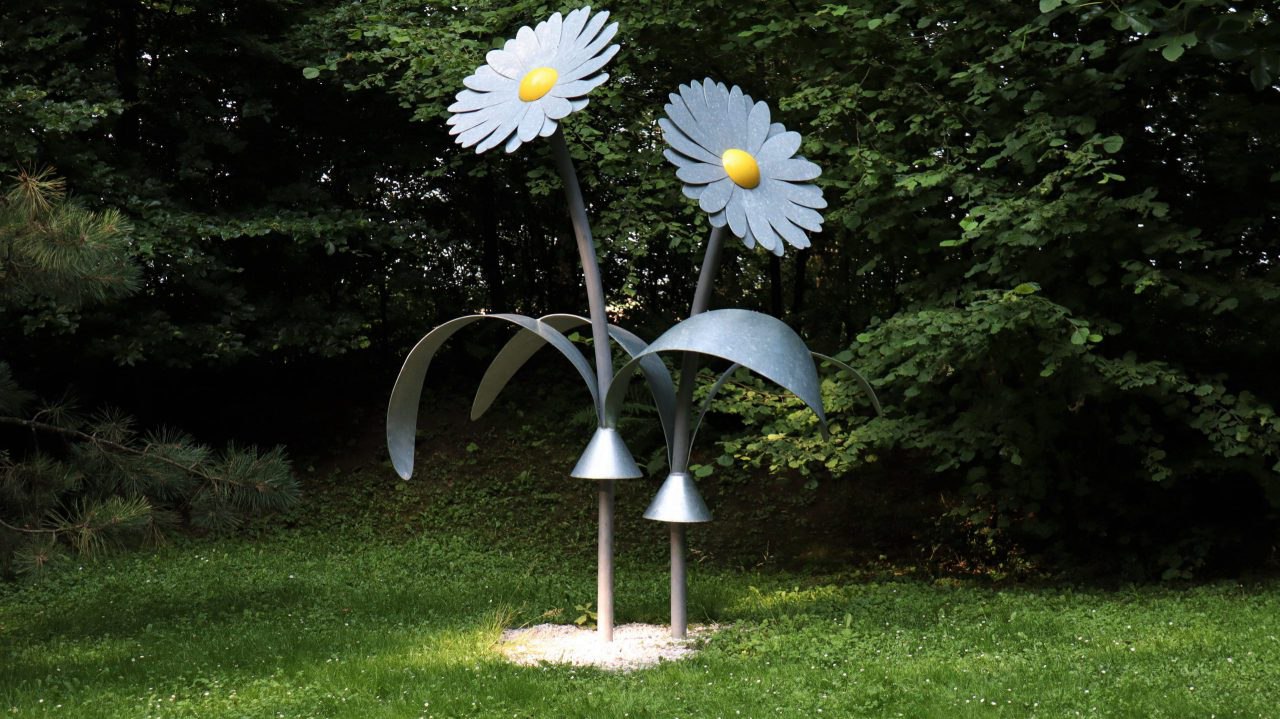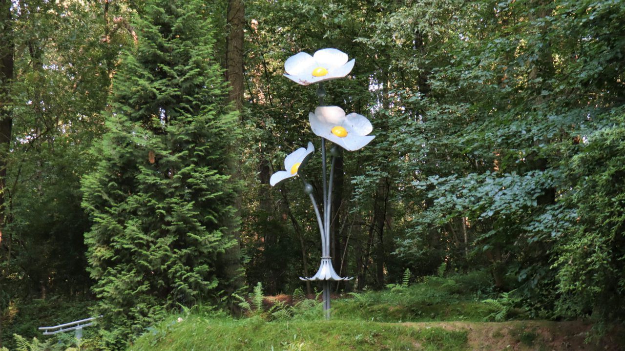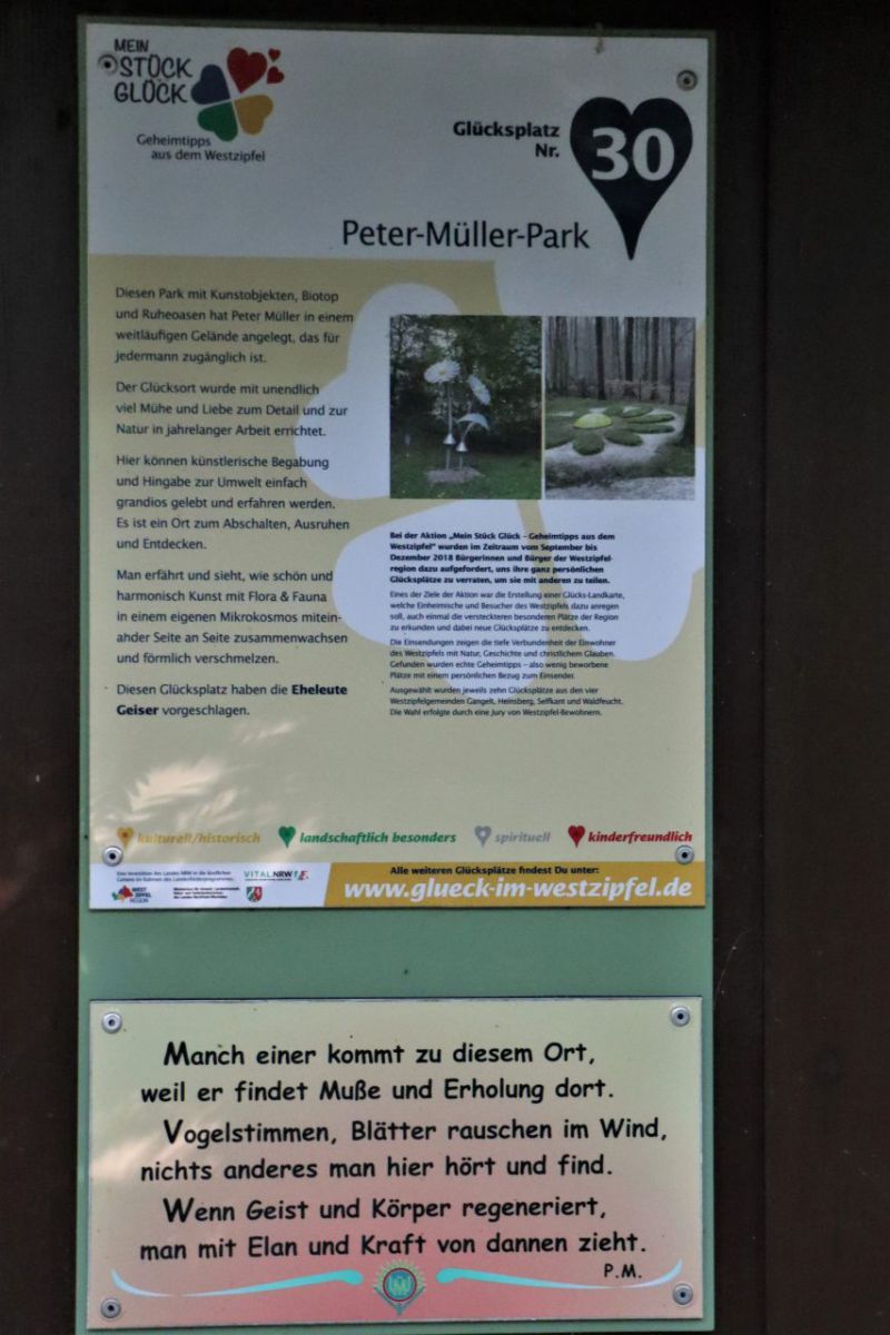 Von Vorst geht es parallel zum Kitschbach zum Peter-Müller-Park, der versteckt im Wald liegt. Ein kleiner aber feiner Privatpark, der für jeden zugängig ist und mit einer Reihe von Kunstwerken aufwartet. Er ist der 2. Glücksplatz auf unserer Wandertour.