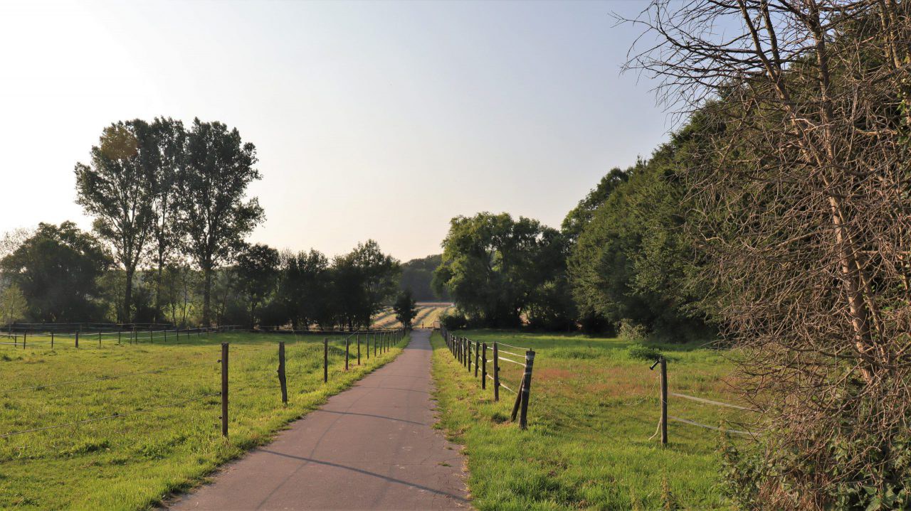Über den Fäkenweg geht es zur Brücke am Kitschbach. Hinter der Brücke biegen wir links ab und folgen dem Weg entlang des Kitschbachs zum Startpunkt unserer Wanderung „Rund um Waldfeucht-Haaren“.