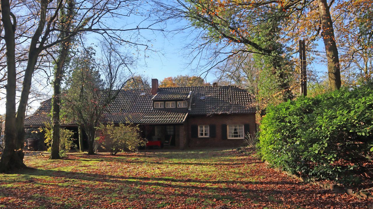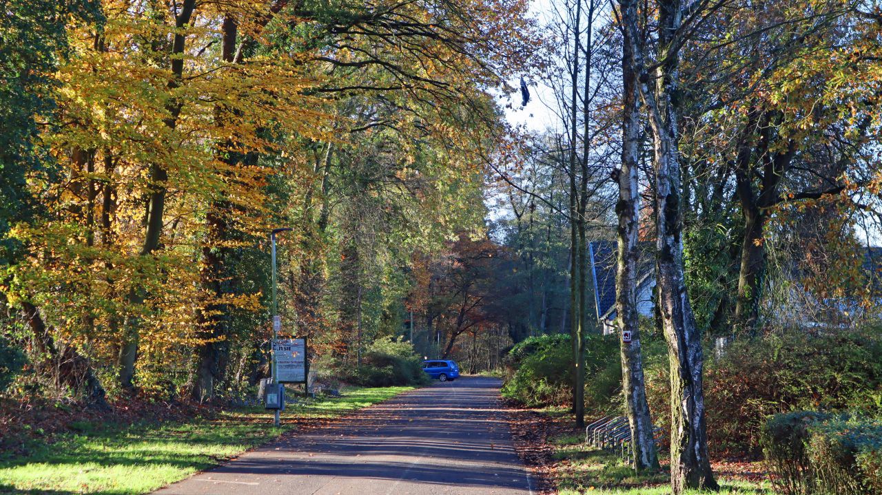 Wir verlassen die Aussichtsplattform und gehen zurück zur Schlossallee. Dort folgen wir der ehemaligen Straße, die heute für den Durchgangsverkehr gesperrt ist. Auf der linken Straßenseite befindet sich Schloss Krickenbeck.
