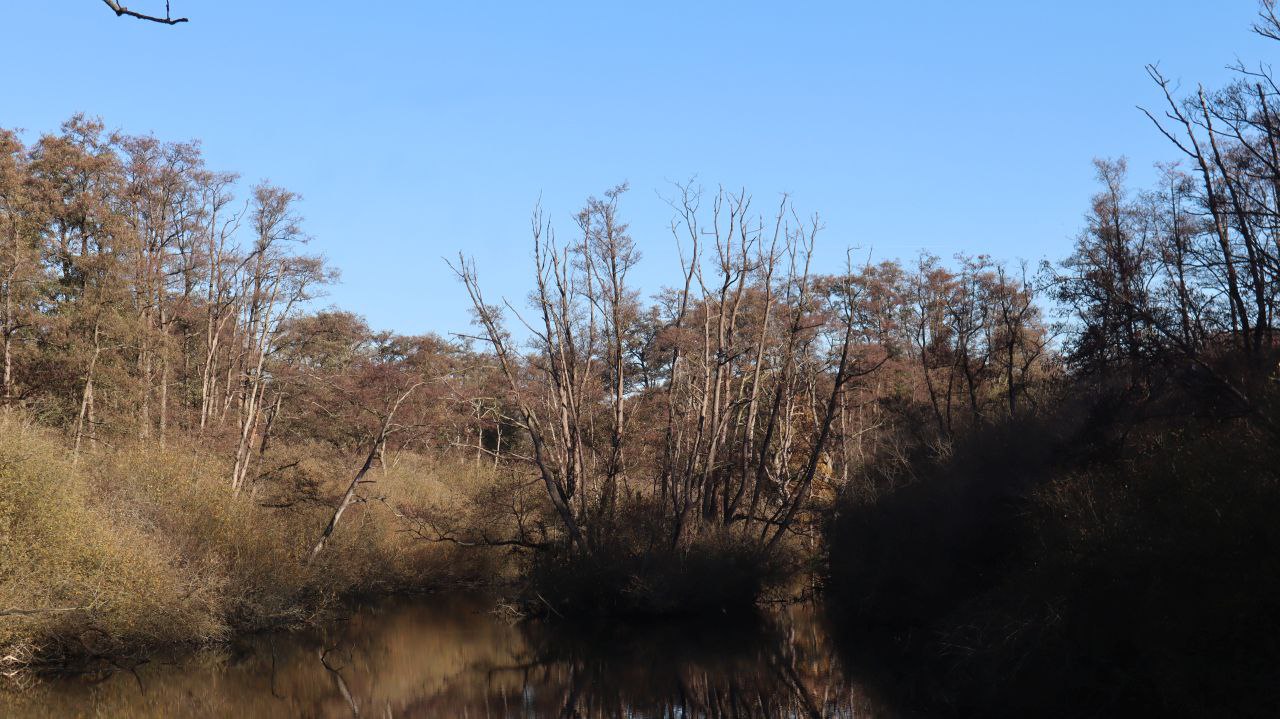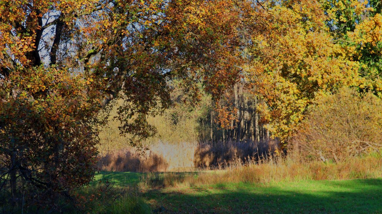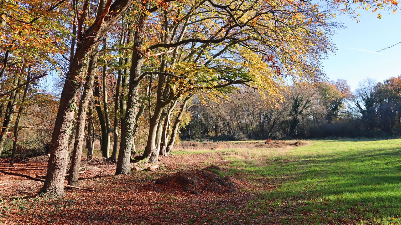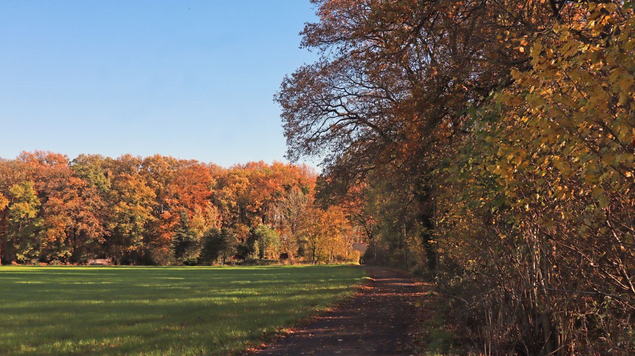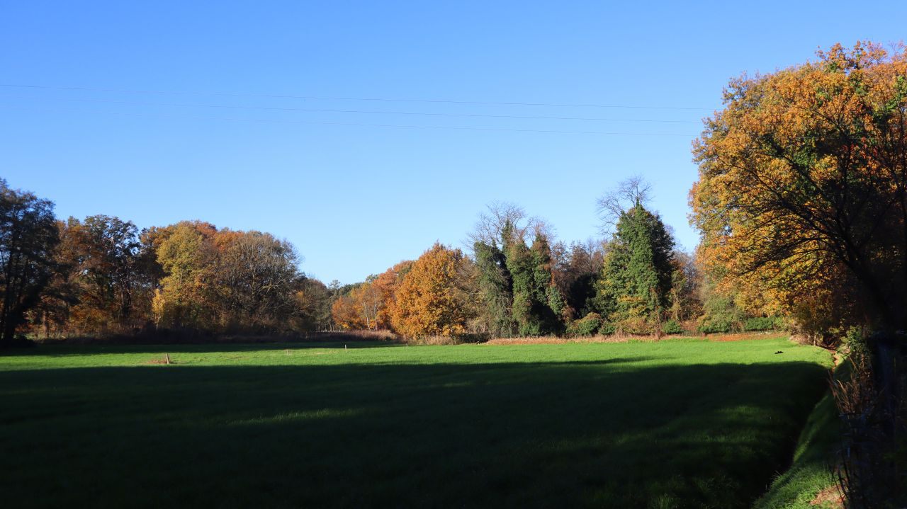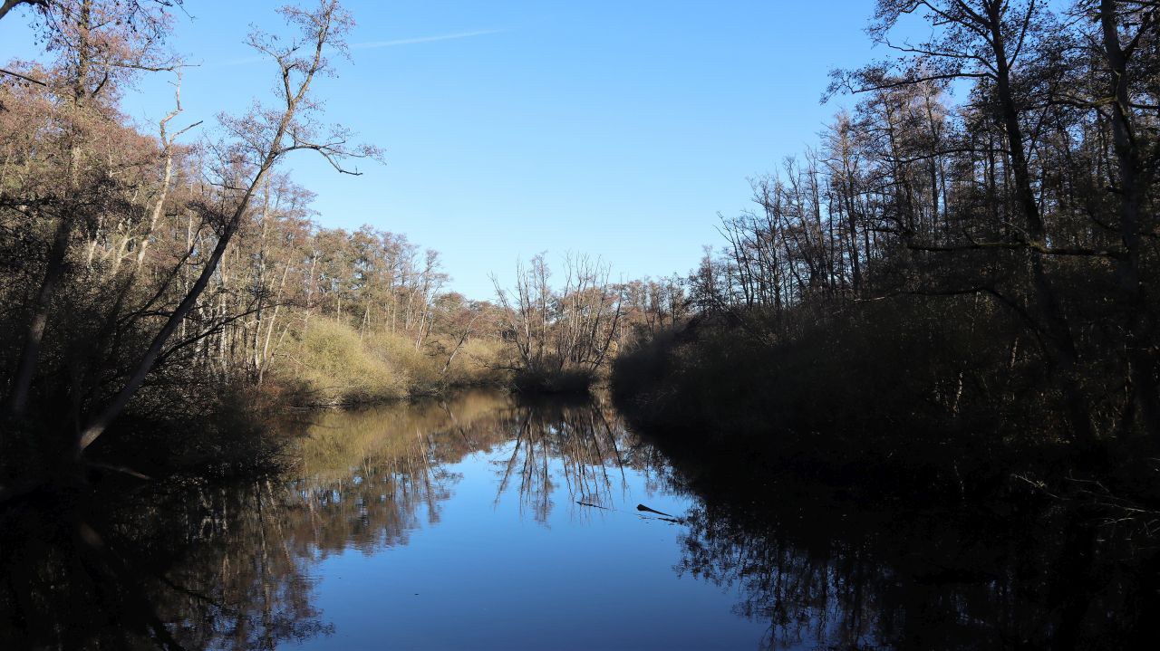 Es geht vorbei an wunderbarer Bruchlandschaft und kleineren Teichen und Tümpeln. Die Beschilderung führt uns von der Leuther Mühle vorbei am Waldrand und einem Damwildgehege zum Perdskamp, wo wir uns rechts halten.