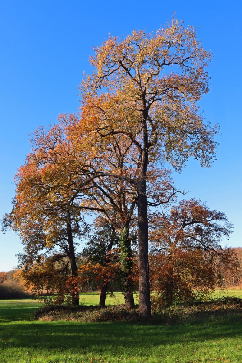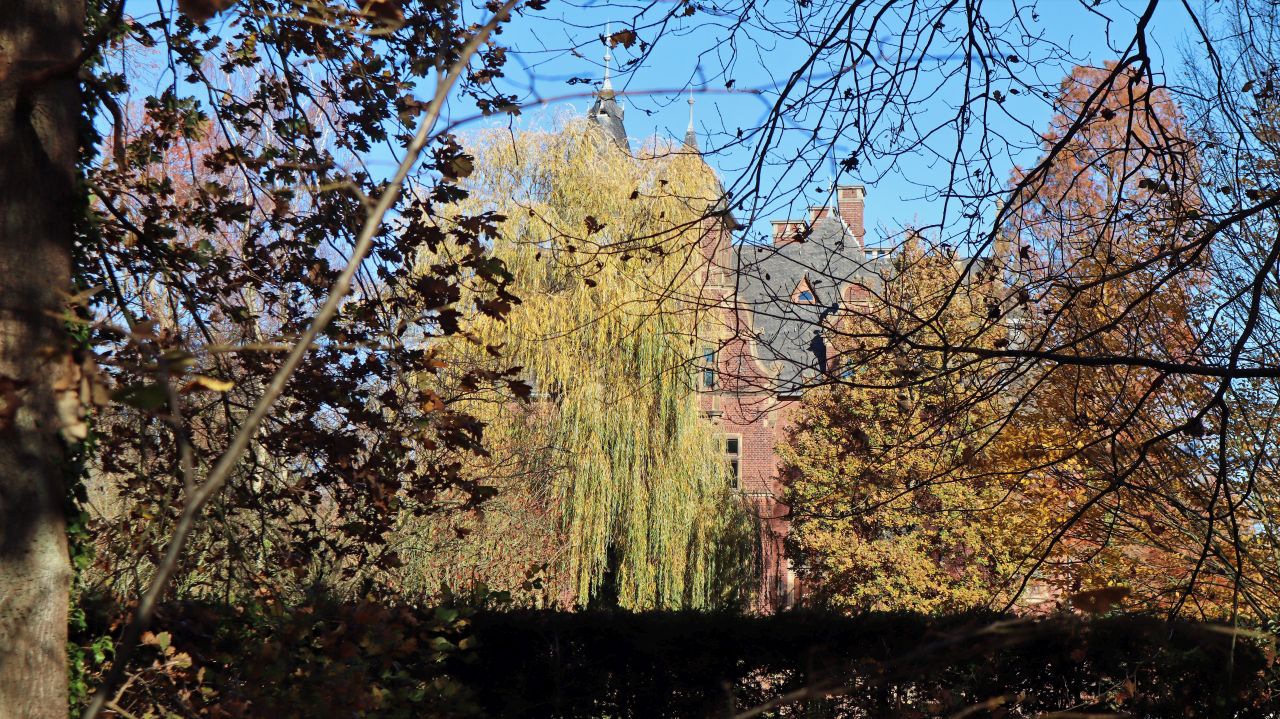 Im Sommer ist der Blick auf das Schloss und die zugehörigen Gebäude durch das Blattwerk der Bäume und Sträucher verdeckt. Im Spätherbst und Winter kann man die Anlage gut sehen.