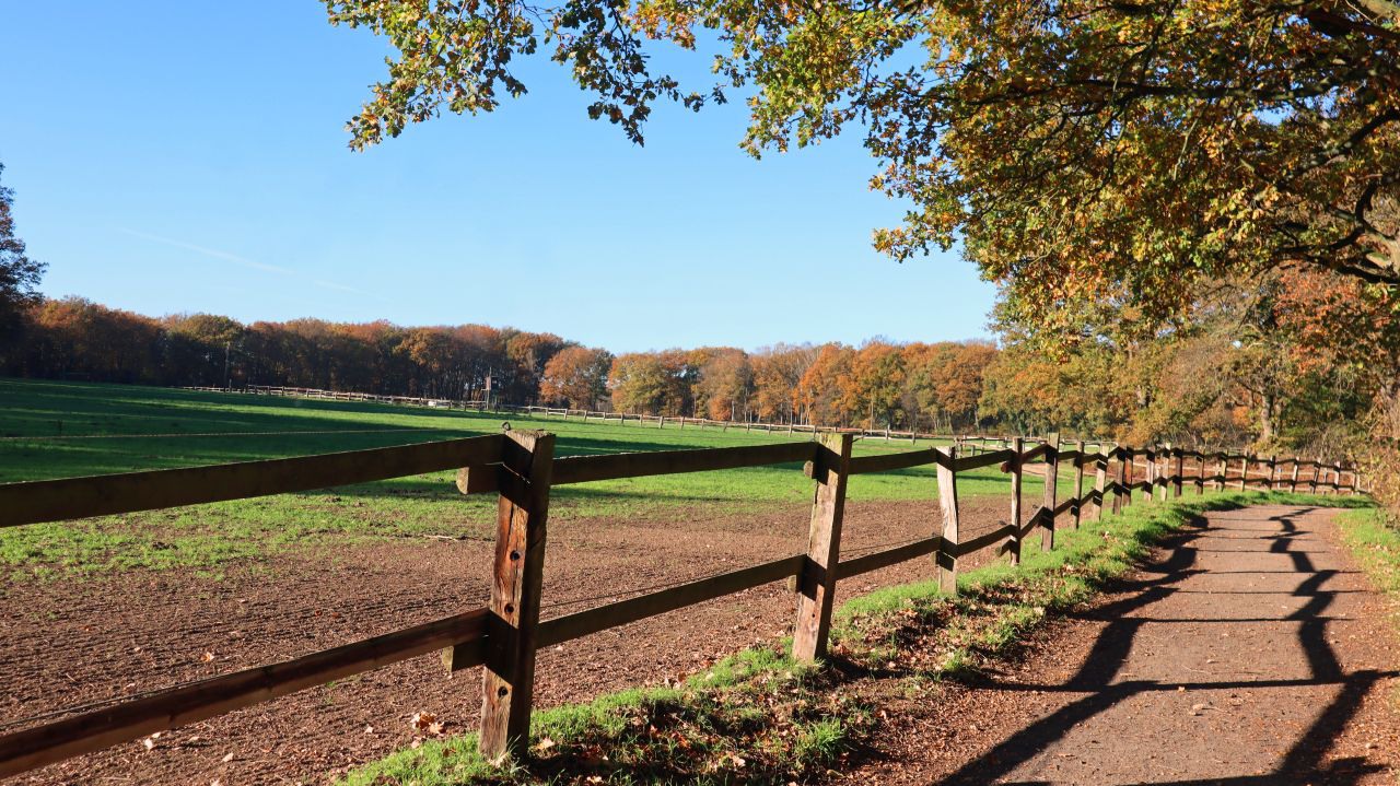 Über den Wirtschaftsweg geht es weiter in Richtung Gestüt Seehof vorbei an einem schönen alten Bauerngehöft und später entlang großer Pferdekoppeln und Waldrand.